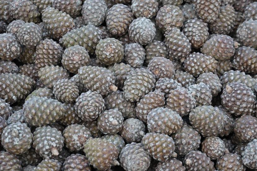 Hasat işlemi oldukça tehlikeli ve zor olmasına rağmen kozalak toplayan işçiler, ölümü hiçe sayıp ağaçlara adeta bir kedi gibi tırmanırken toplanan kozalaklar, çuvallarla işleme tesislerine getiriliyor.