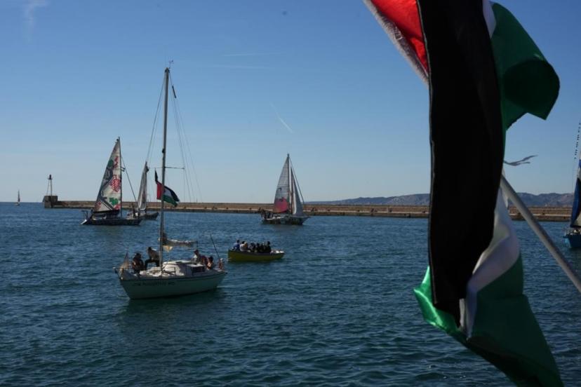 Ellerinde Filistin bayrakları taşıyan Marsilya sakinleri, tekneleri "Yaşasın Filistin halkının mücadelesi", "Gazze, Marsilya seninle", "Hepimiz Gazze'nin çocuklarıyız" ve "Filistin'e özgürlük" sloganları ve alkışlarla uğurladı.