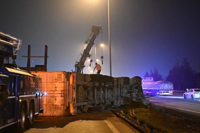 Kocaeli’den İstanbul yönüne ilerleyen tır, lastiğinin patlaması sonucu kontrolden çıkarak bariyerlere çarpıp devrildi.